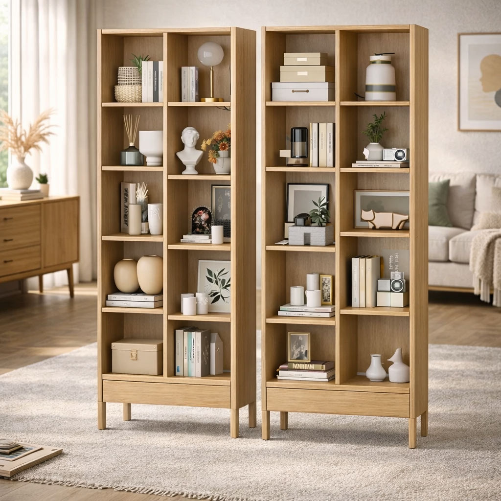 Wooden arched bookshelf features multiple open shelves for books and decor. Solid frame ensures stability. Smooth finish enhances natural tone. Vertical design saves space and fits modern interiors with clean aesthetic appeal.